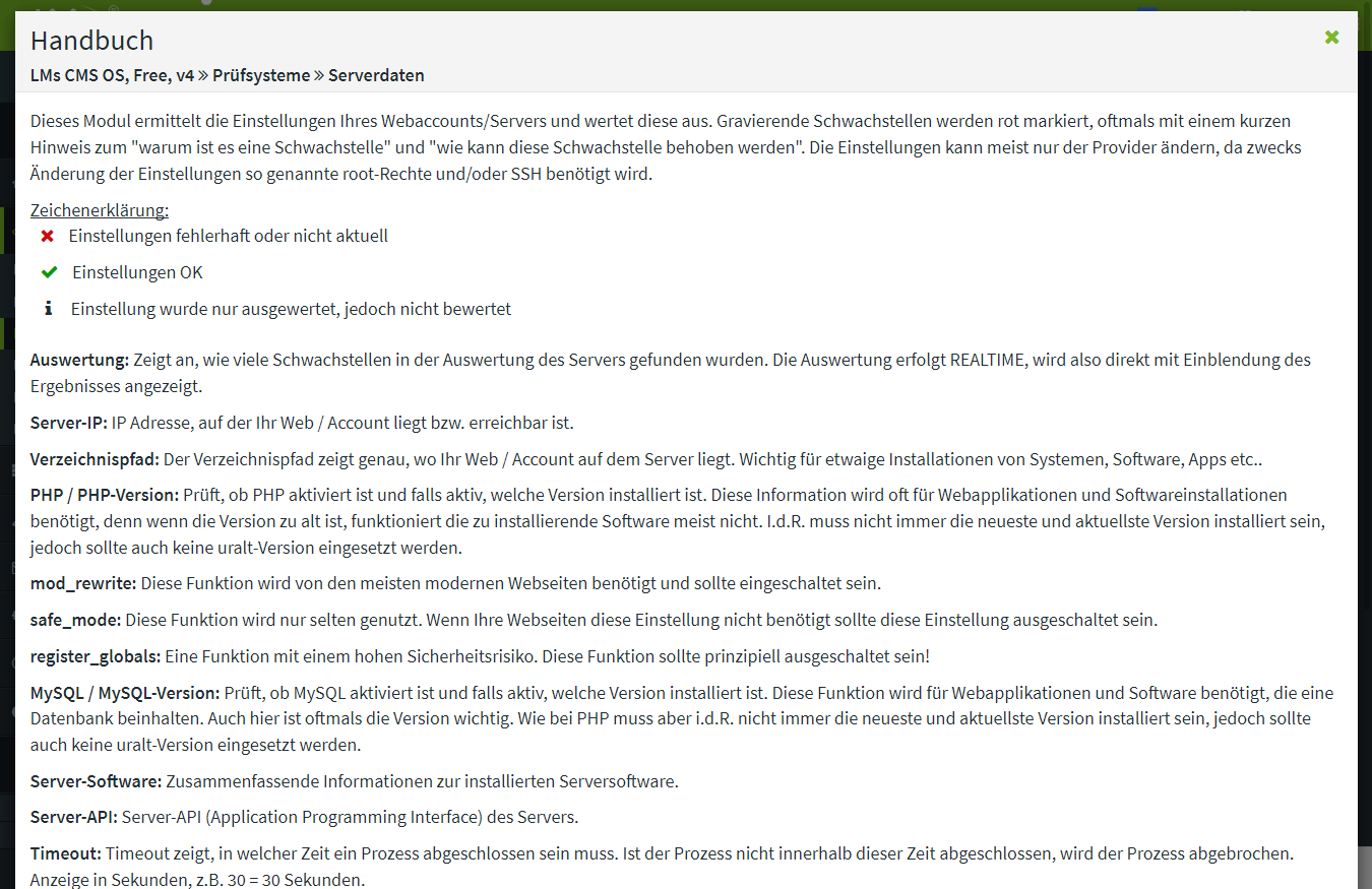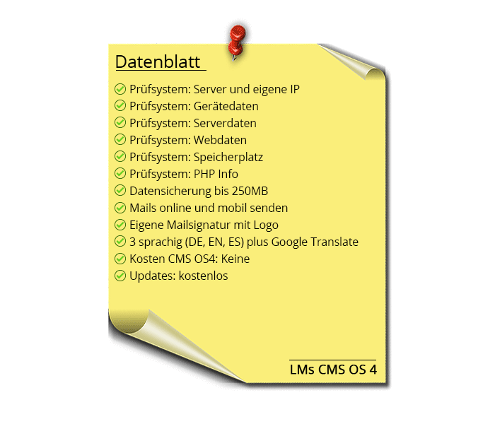 Das LMs CMS OS [Operation System] ist ein CMS Betriebssystem für Webseiten und Webaccounts, mit dem Sie schnell und unkompliziert relevante Web-, Server- und PC-Daten wie Server IP oder eigene IP Adresse; Serverdaten und Servereinstellungen, zum Beispiel PHP-/MySQL-Version, mod_rewrite, Uploadgröße, Verzeichnispfad, Serversoftware etc.; die Einschaltung von PC Daten, zum Beispiel Cookies, Java, Java-Script, Flash, etc.; prüfen können. Das OS System liest diese Daten schnell und einfach per Klick aus.